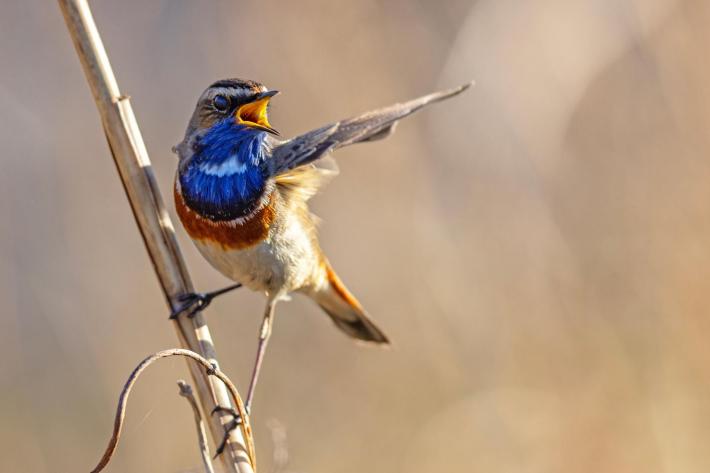 Slavík modráček je méně známý příbuzný slavíka. Vizuálně patří mezi nejkrásnější ptáky u nás. Samci jsou snadno rozpoznatelní. Mají nápadně modré hrdlo s červenohnědým nebo bílým pruhem. Pro ornitology je výskyt tohoto ptáčka jasným signálem, že se v krajině zlepšují podmínky pro mokřadní ekosystémy.